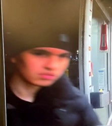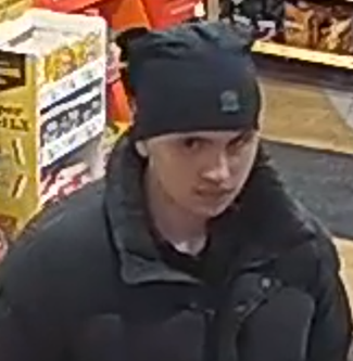 The suspect (below) is described as a male with a fair complexion, late teens to early 20s, slim build, clean-shaven, with dark eyes. He was last seen wearing a black toque, black puffer jacket, black jeans, and black Nike Air Force shoes.
