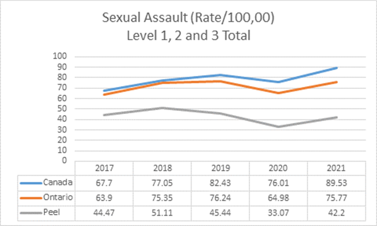 In 2022, there was a rise in Level 1 Sexual Assaults across the nation, which accounted for a 40% increase in violent CSI. Peel Region is no exception to these stats. Our data indicates an increase of 30% from 2020 to 2021 in Level 1 sexual assaults. While this is below the Canada and Ontario rates, Level 1 sexual assaults is a prominent issue that needs addressing. This is why we are committed to working with our partners at the Safe Centre of Peel to build better capacity in providing wrap-around supports and services to survivors of intimate partner violence and human trafficking.