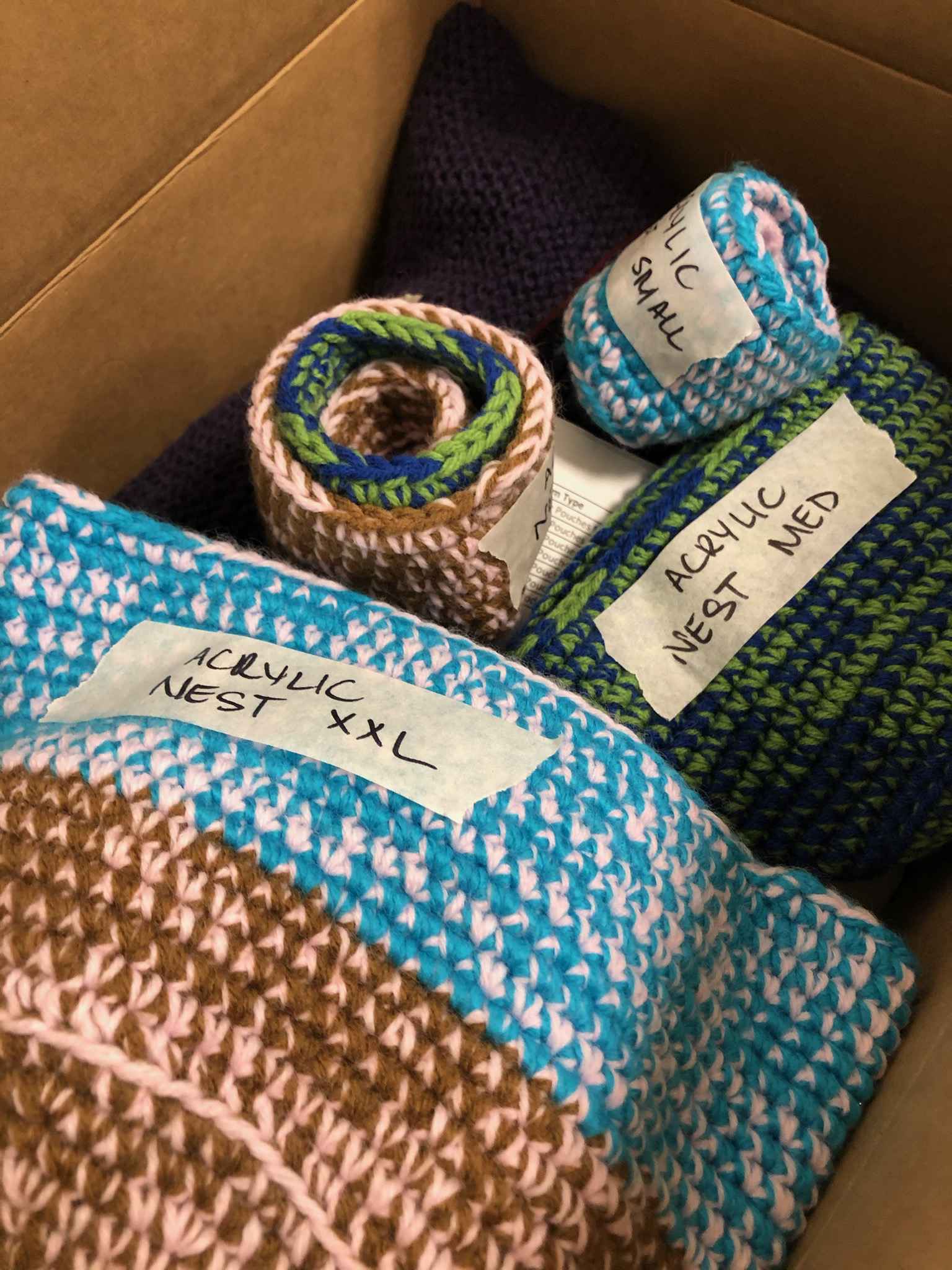 Renee Patenaude a volunteer from Mississauga collected all 839 pieces (9 boxes), made by hand, in under 2 weeks, by those individuals living in our community. Each large baby Kangaroo pouch takes approximately 60-90 minutes (depending on your skill level) and 50,000 stitches to complete. As well as a lot of love going into each and every one.