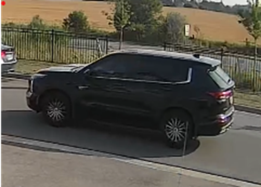 The suspect vehicle is described as a new black four-door Mitsubishi SUV. Inside the vehicle was a working computer situated between the driver and passenger seat with a police sticker attached.