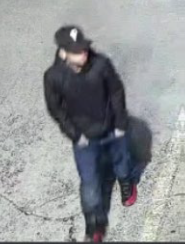 - Male, Black, approximately 20-35 years old, about 5'6 "or 5'7" tall, heavy build, dark complexion, wearing a gold cross chain, with a buzz cut and possibly a beard, with a, wearing a white baseball cap and glasses.
